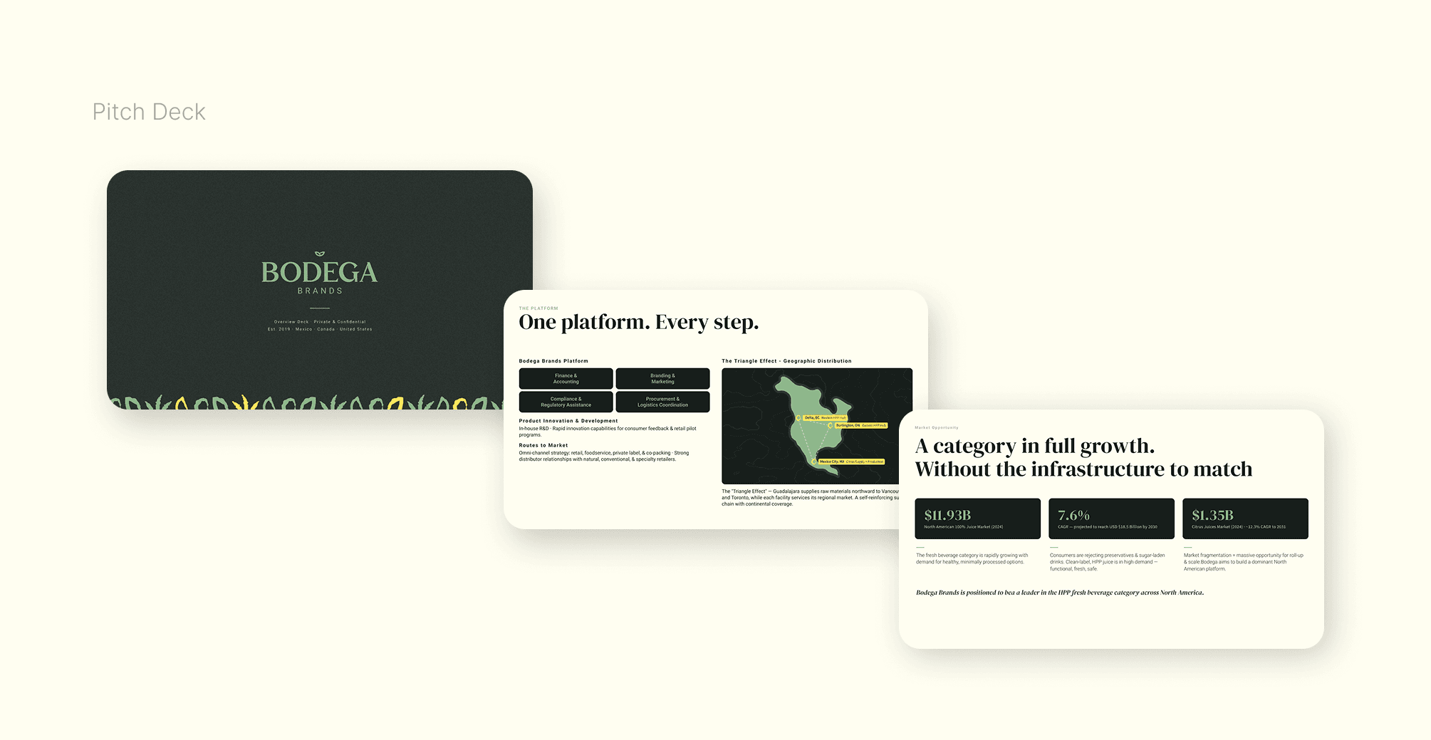 Bodega Brands is a house of brands operating in the fresh beverage space. As the parent company behind a growing portfolio, it needed an identity that could stand confidently on its own, separate from the brands beneath it. The brief covered everything from a brand refresh to a full website design and investor deck.